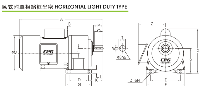 二)下圖為縮框輕載型CH..A(B)單相臥式齒輪減速電機詳細外型尺寸參數(shù):
